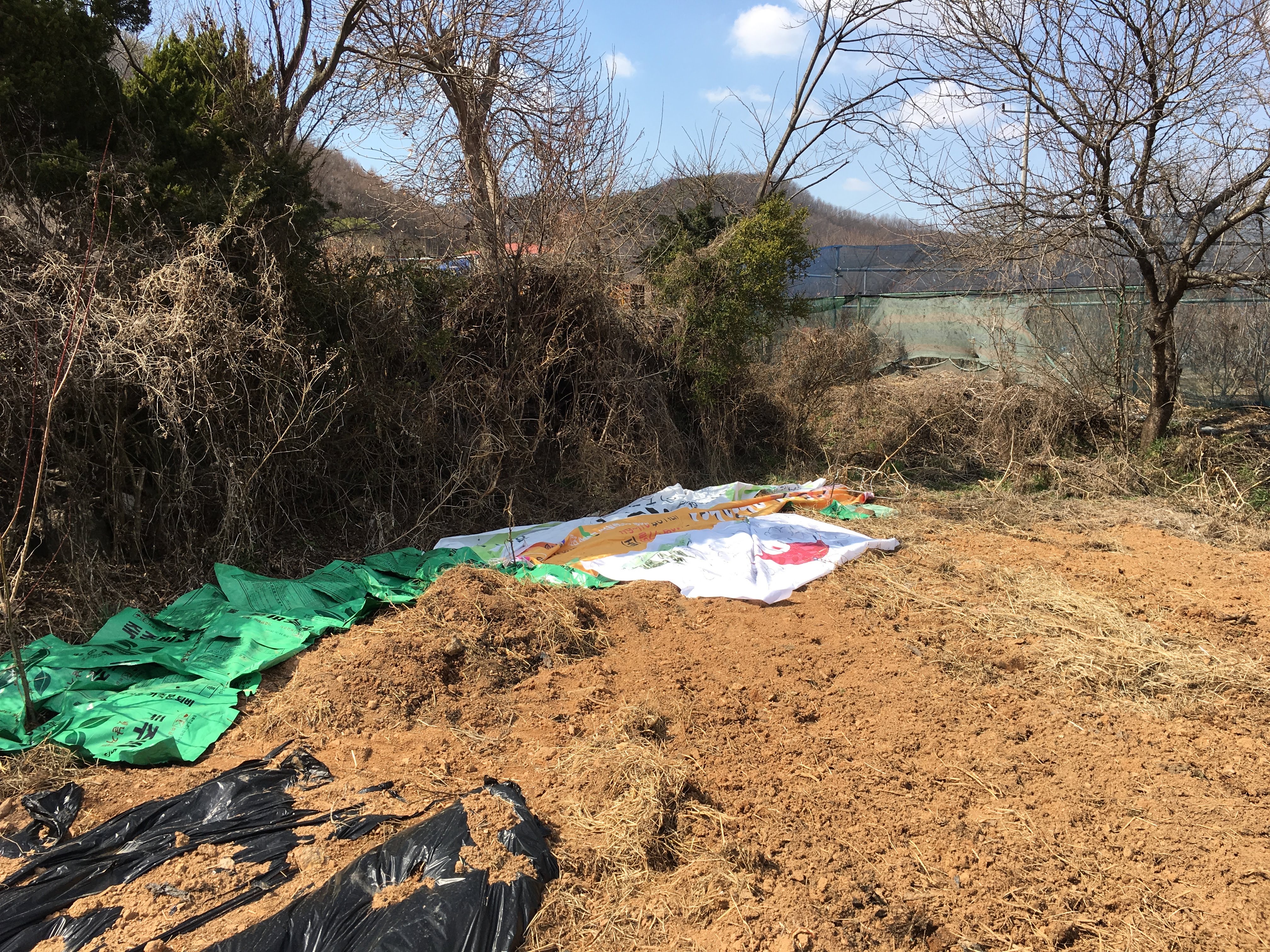 작년에 심은 매실나무 대추나무 근처에 비닐로 멀칭하고
