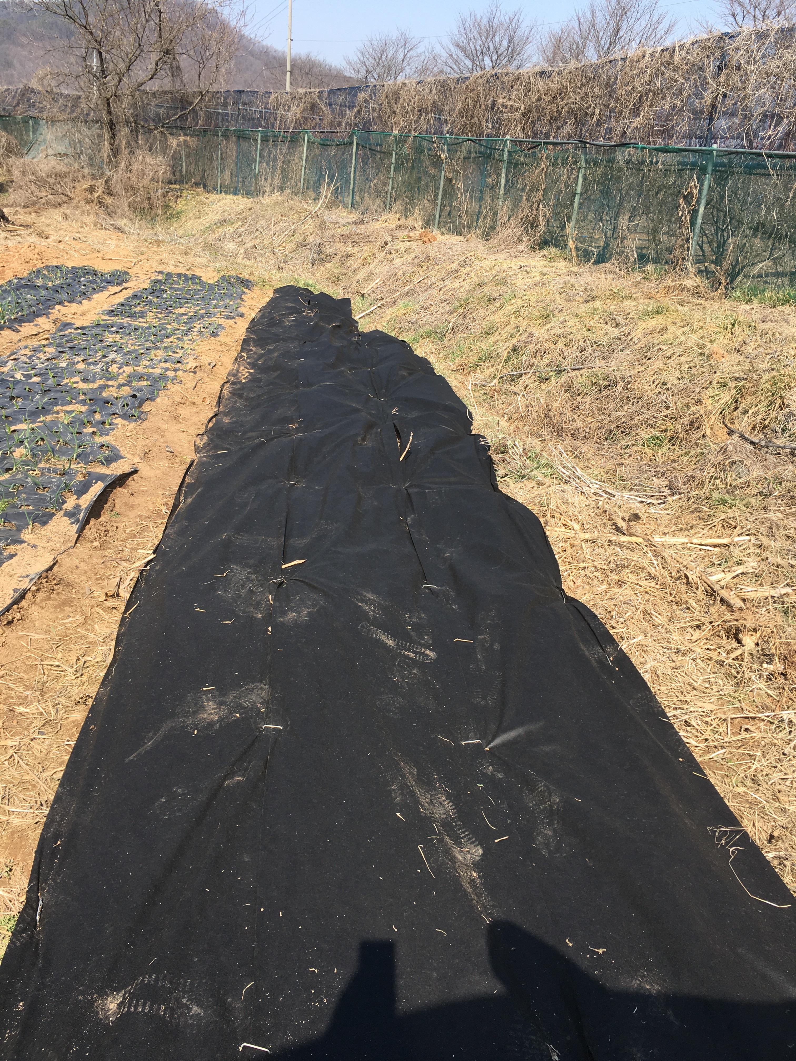 밭 주변을 부직포로 덮어 풀이 들어오는 것을 완전 차단한다!
