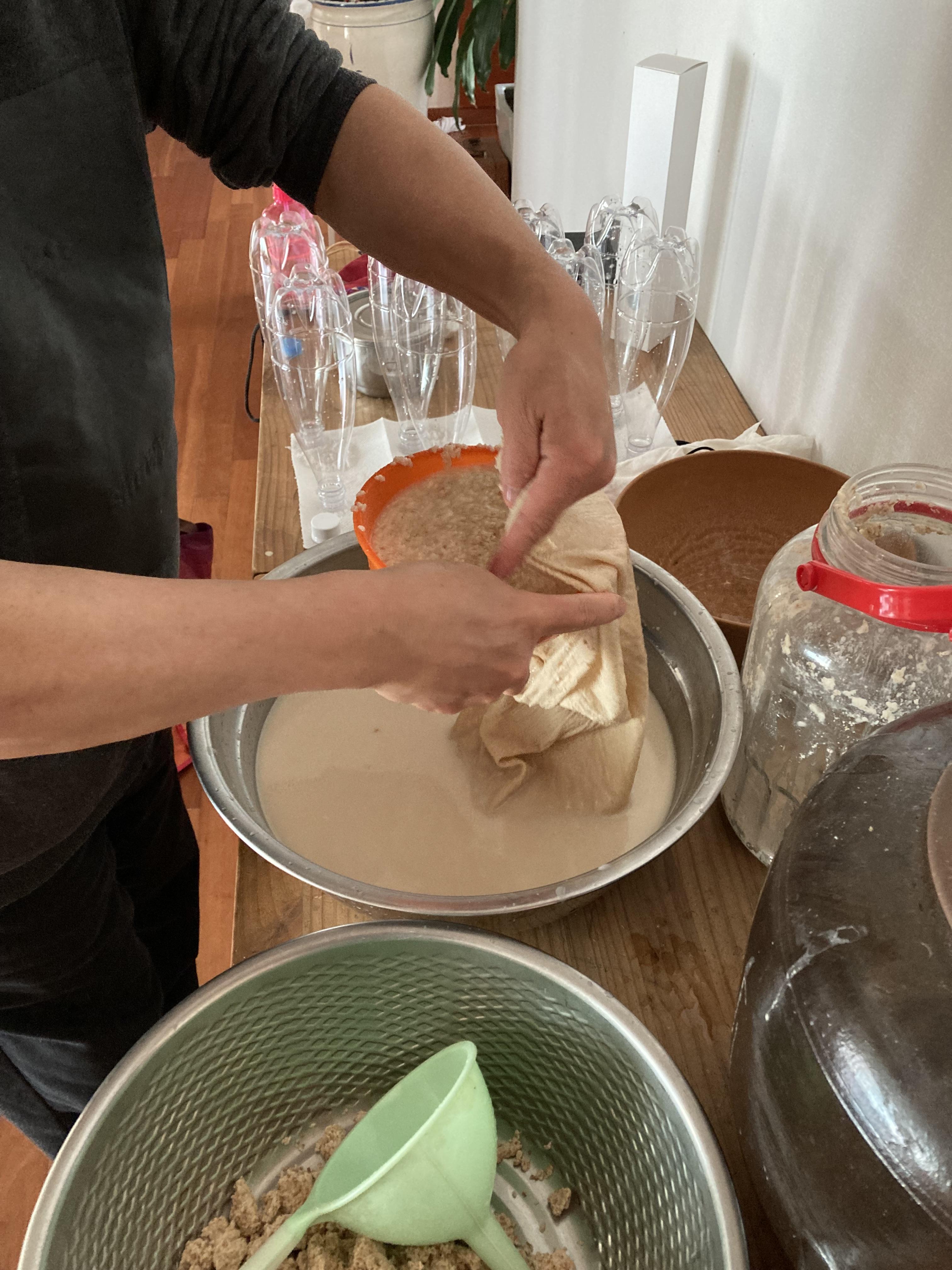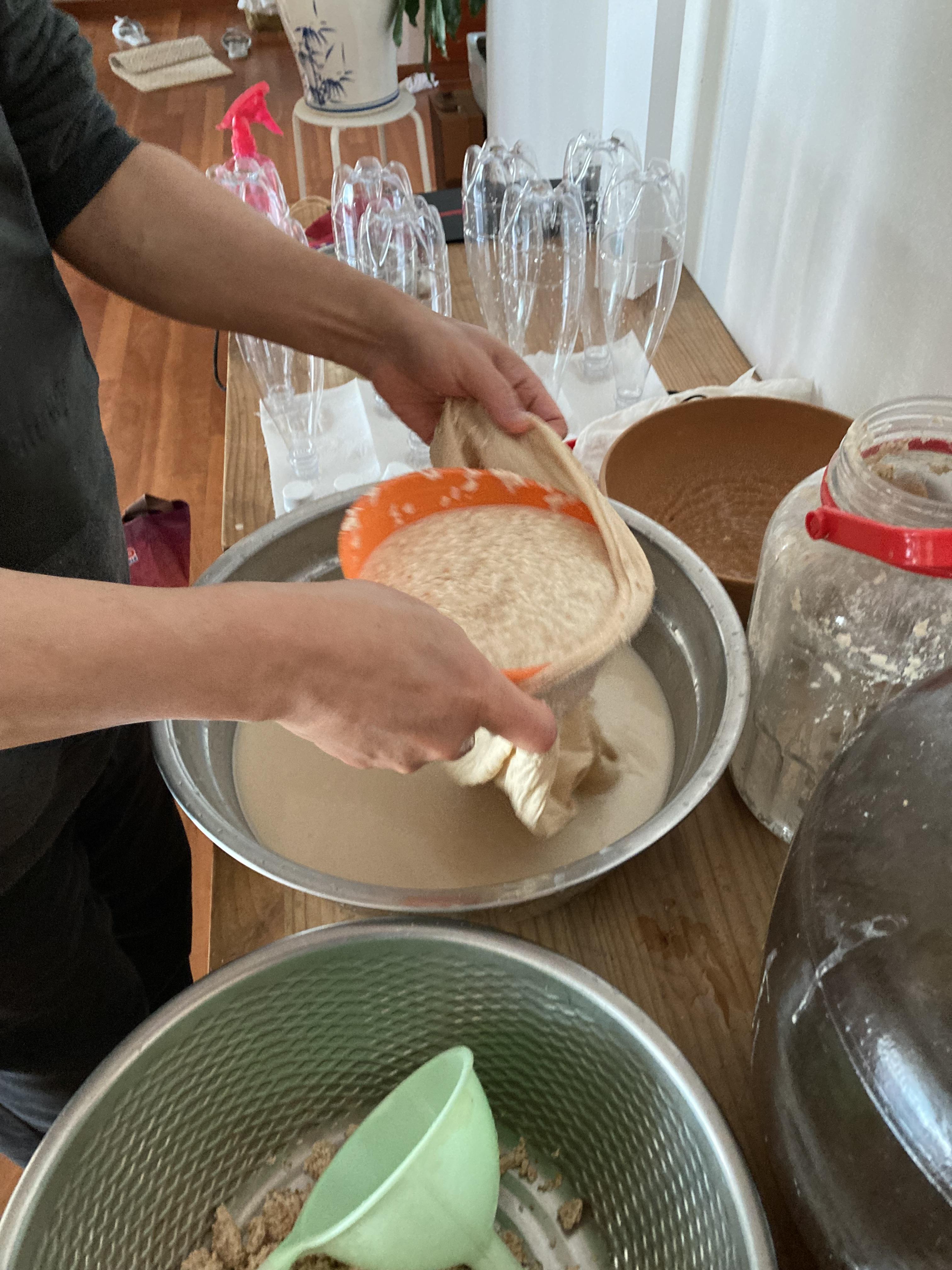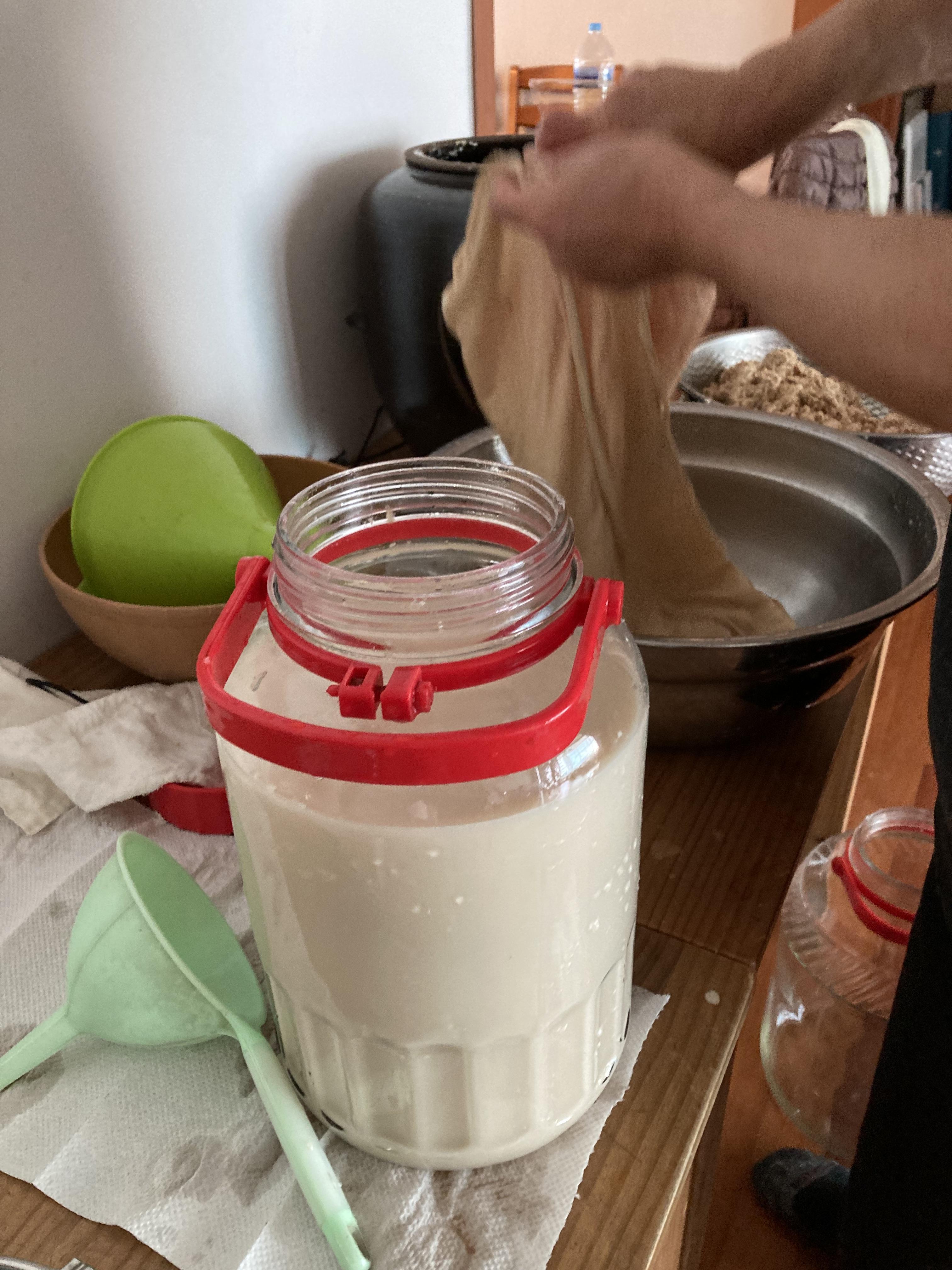 면보에 넣어서 짜고 찌꺼기는 걸러서 나중에 물 1리터 정도 넣고 한번더 짠다. 그럼 그냥 음료수 같은 막걸리가 나온다.