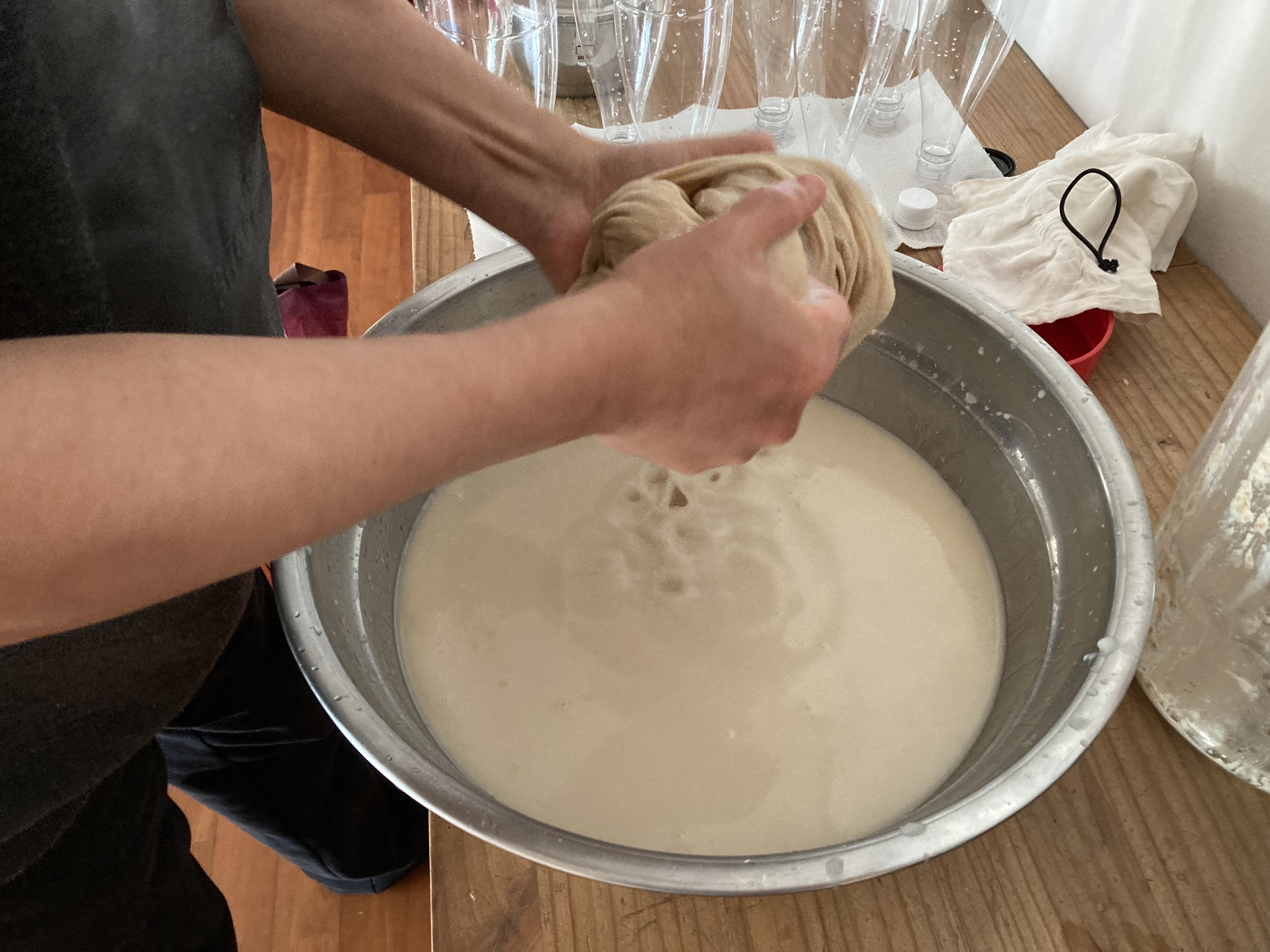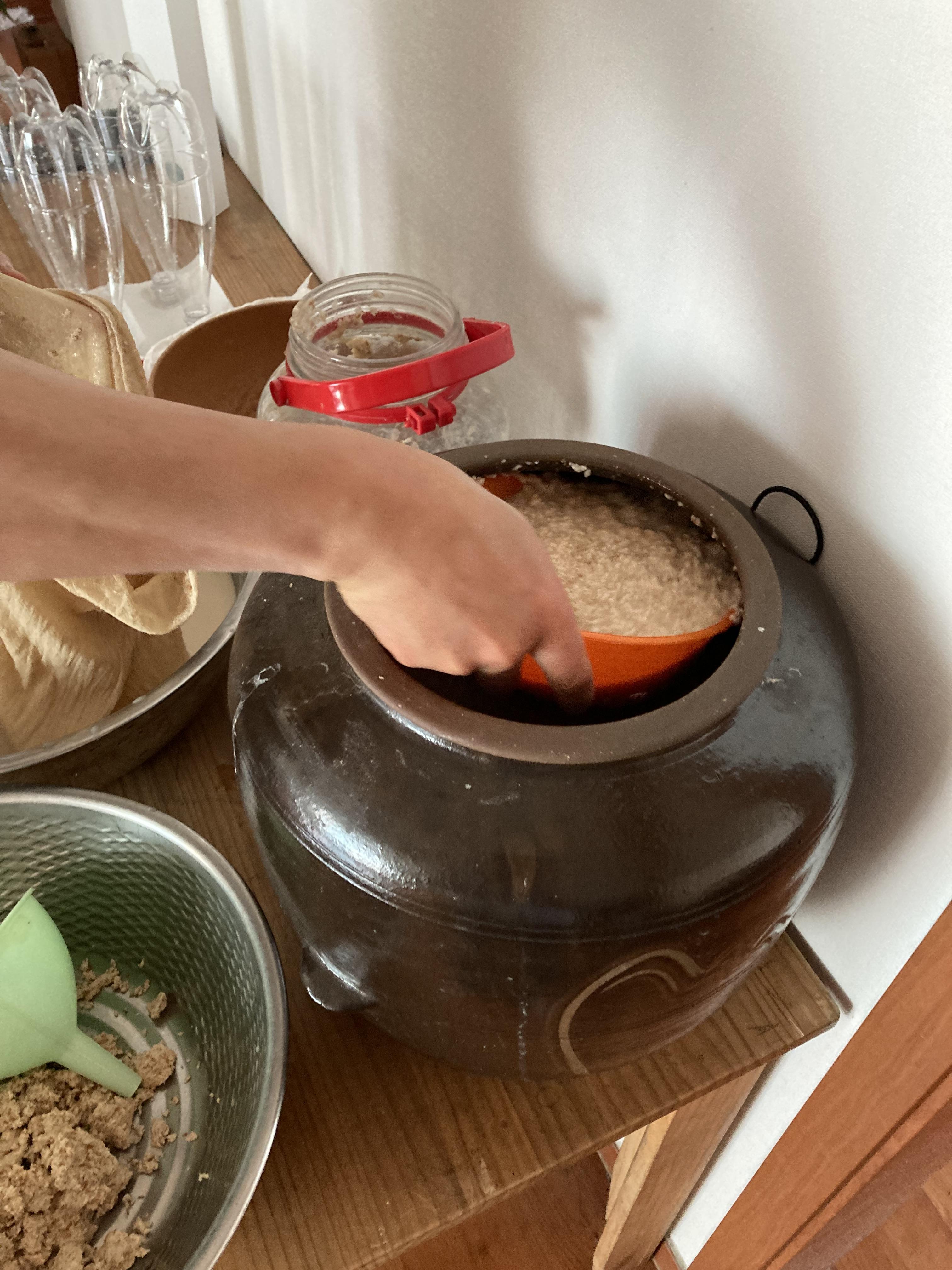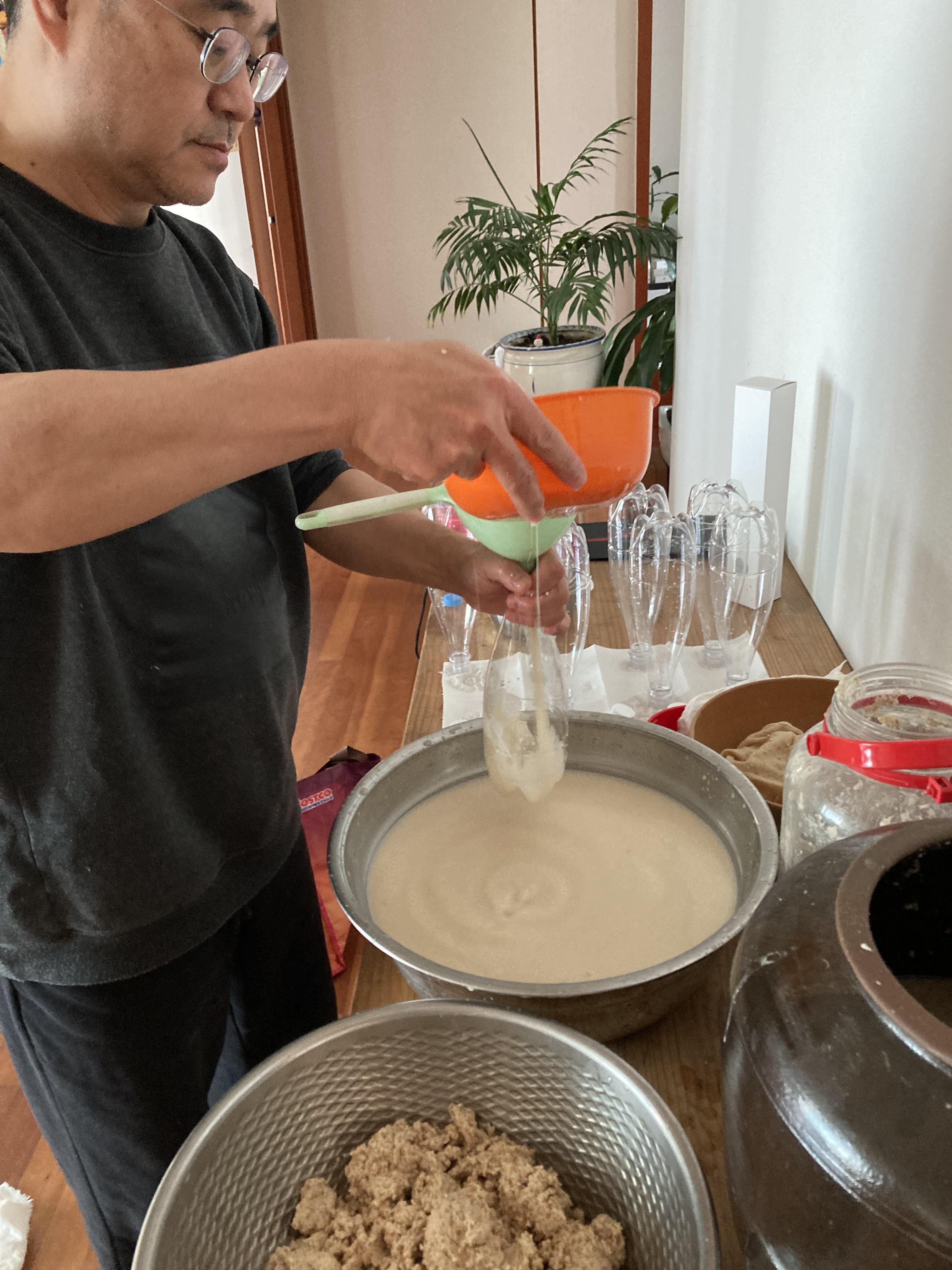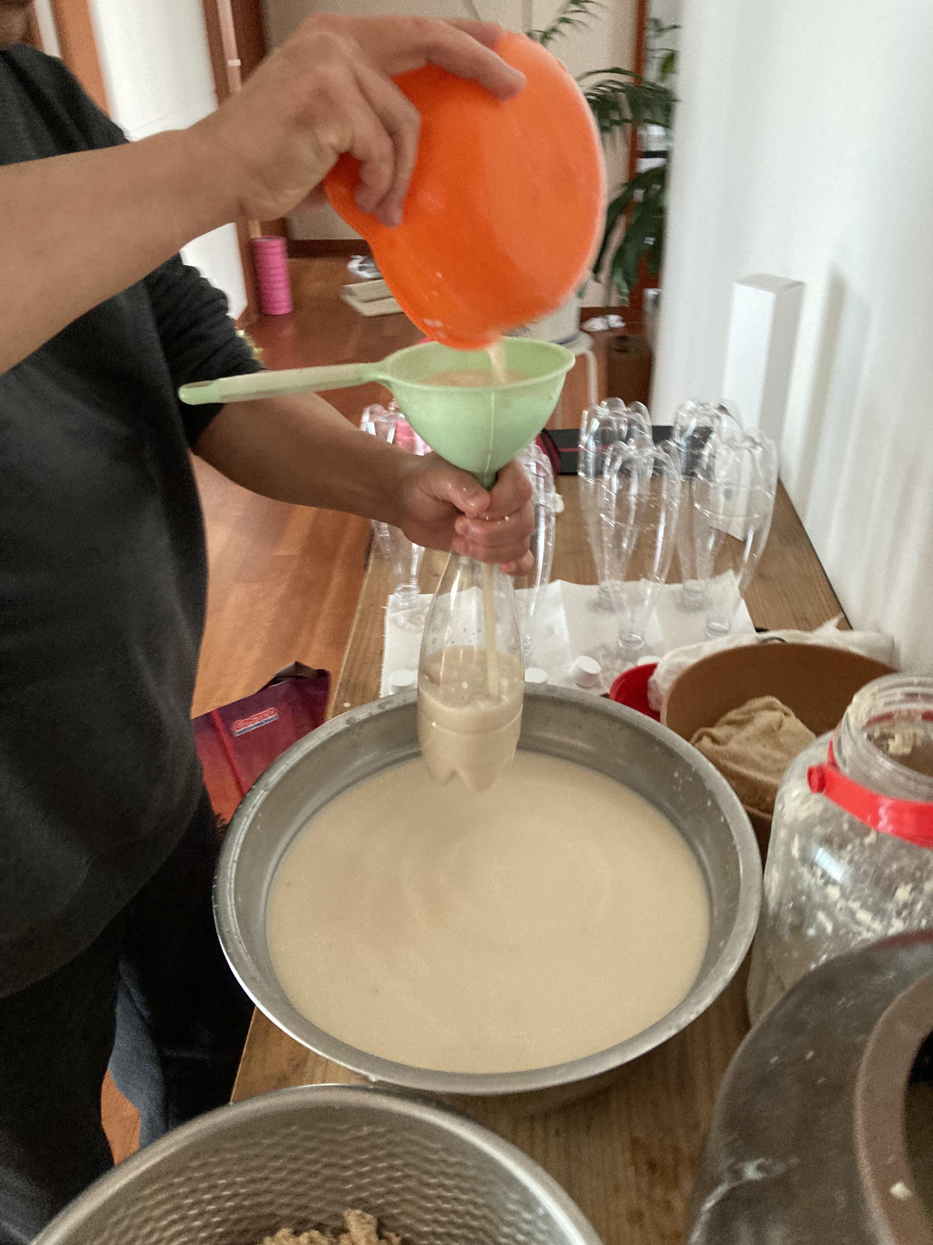 면보에 넣어서 짜고 찌꺼기는 걸러서 나중에 물 1리터 정도 넣고 한번더 짠다. 그럼 그냥 음료수 같은 막걸리가 나온다.